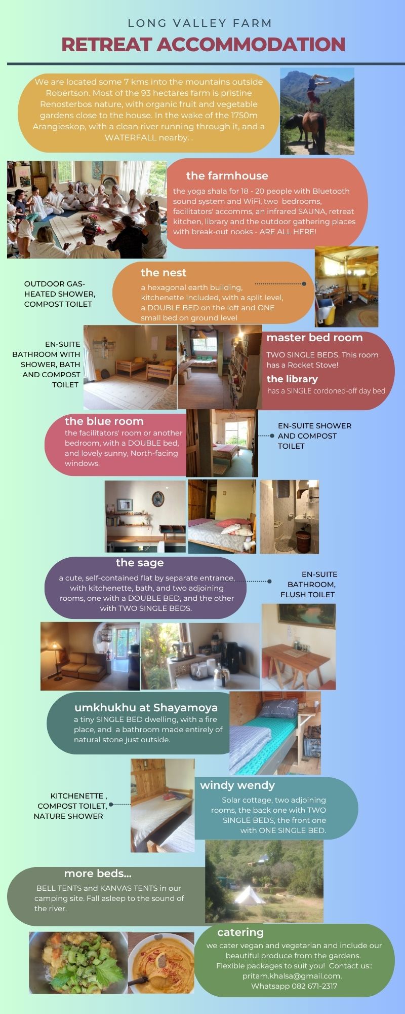 Accommodate professionally up to 20 retreatants in this rustic beauty spot in nearly perfect wilderness of a 100 hectare intentional farm, an easy 2 hour journey from Cape Town.